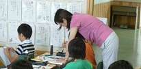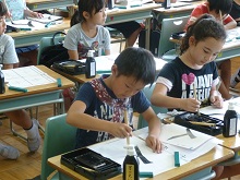 硬筆も終わり、書写の時間が再開しています。書写の時間は、新井先生に教わります。今日は「人」という文字を書きました。「はいり」や「はらい」に気をつけて、真剣に書いていました。