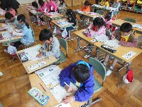写真は、国語の時間にひらがなを練習している様子と給食の配膳の様子です。