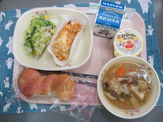 今日の給食は、ツイストパン、チキンのフレーク焼き、ハムのマリネ、にぼうとう、ゼリーでした。