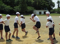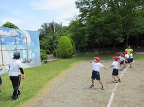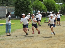 2時間目休みに校庭で、1年生は「的当て」2年生は「鉄棒」3年生は「キャッチボール」4年生は「登り棒」5年生は「30M走」6年生は「長縄8の字跳び」です。