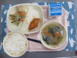 今日の給食は、ご飯、ヤンニョムチキン、切り干し大根とツナのナムル、トックスープでした。