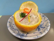 素敵な飾りが施され、柚子の器に入った自然薯のとろろです。