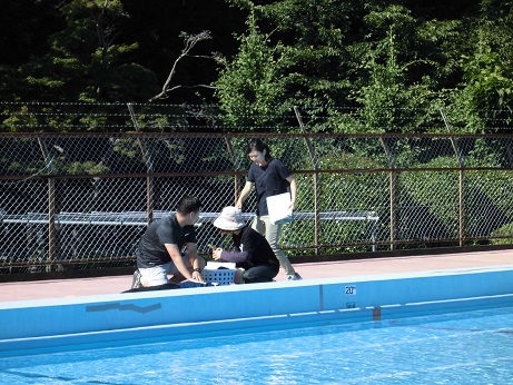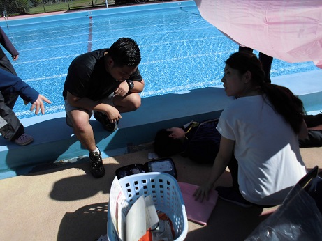 水泳の授業中に、事故が起こったという想定のもと、授業者①~③、応援教職員に