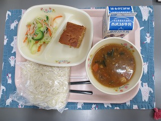 今日の給食は、マーボーラーメン、深谷レンガパンケーキ、春雨サラダでした。