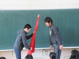 色別応援団旗を次の最高学年になる5年生に手渡し、無事に引き継ぎを終えました。
