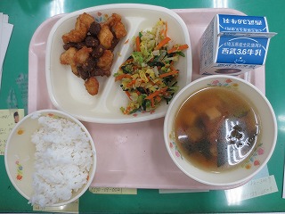 今日のメニューは、ごはん、すだちチキン、骨丸ごとおかか和え、さわにわんでした。今日は、今年度最後の給食でした。6年生にとっては小学校生活最後の給食で、クラスみんなで円になって食べており、とても楽しそうでした!(^^)!