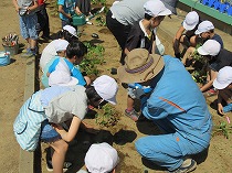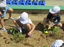 2年生は、生活科で野菜の苗を植えました。ボランティアの方に教えてもらいながら、きゅうり、なす、トマト、ピーマン、さつまいもの苗を植えることができました。これから、水くれをしっかり行っていきます。