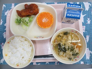 今日の給食は、デミカツどん、かきたまじる、きっかミカンでした。