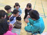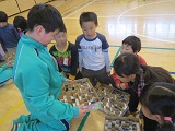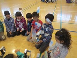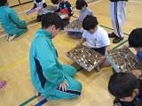 本日、3校時に川本中のお兄さんお姉さんが来てくれました。総合的な学習の時間における交流で「手作りおもちゃを作り、遊び方を伝えよう」ということで、たくさんのおもちゃを作ってきてくれました。