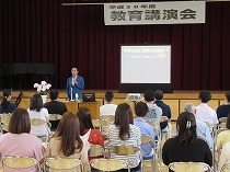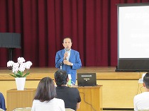 2時間目の教育講演会は、県立中央高等技術専門学校講師の小島久雄氏を講師に招き、「海外生活体験から学んだこと」~異文化とのコミュニケーション~の演題でお話していただきました。海外生活では、語学も大切ですが、コミュニケーションが大切ということでした。