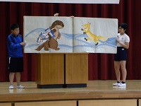 大型絵本「きつねとかわうそ」の読み聞かせや〇×クイズ、