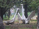 学校のシンボルの白鳥は子供たちを悠然と見つめます