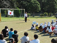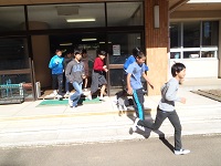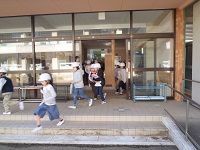 今回は「たつまき」を想定した訓練でした。カーテンをしめたり、ヘルメットや衣服などで頭や首を守る姿勢をとったりするなど、真剣に避難行動をとることができました。