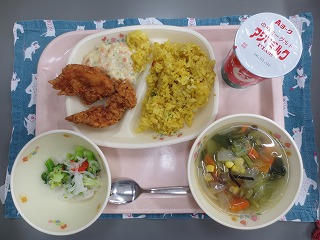 今日の給食は、カレーピラフドリア風、フライドチキン、クリスマスカラーサラダ、野菜コンソメスープでした。クリスマスメニューの献立に、子どもたちのテンションも上がり大喜び!!