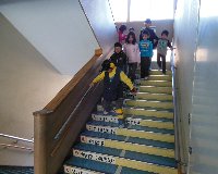 車いす体験では、でこぼこ道や坂道、段差のあるところを自分で操作したり、支えたりしました。高齢者疑似体験では、おもり付きベストなどを身にまとい、階段や廊下を歩きました。