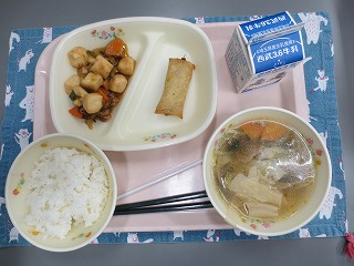 今日の給食は、ごはん、はるまき、韓国風煮豆腐、ワンタンスープでした。