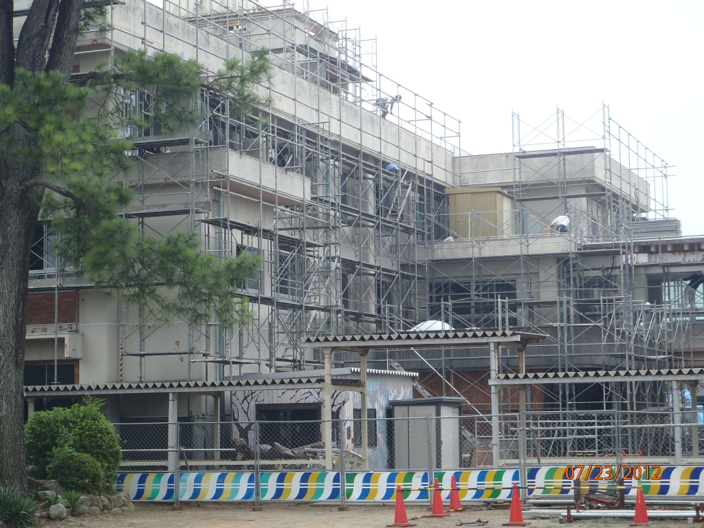 学校の南校舎を見てみると工事の足場が校舎を取り囲み、改修工事の進み具合がうかがえます。