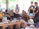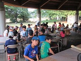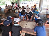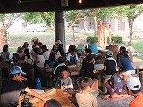 午前6時~子どもたちは6時に起床し、校庭でラジオ体操をすると、野外給食場で朝の集いを行いました。