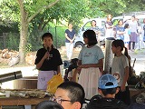 ボールにねかせてあるパンだねを机に広げ、それを薄くのばしますが、なかなかきれいに薄く広がらずにみんな苦労していました。どうにかこうにかたねをのばすと、6年生が包丁で細く帯状に切り分けてくれます。それを大きな竹の棒に伸ばしながら巻き付けて火にあぶって焼きます。自分のパンは自分で焼くので、みんな一生懸命熱い火と格闘していました。