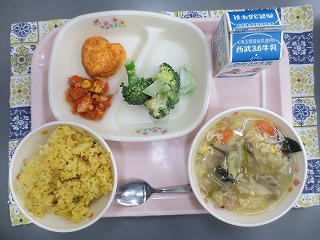 久しぶりに給食で食べたジャンバラヤは、何杯でも食べられそうなくらいおいしかったです(*^-^*)コンソメスープは、とても温かくて、寒い日にぴったりでした!!
