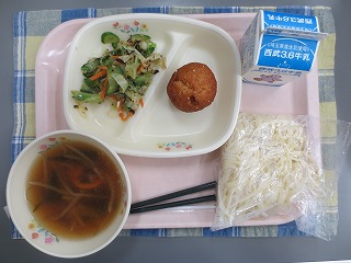 今日の給食は、もやしラーメン、手作り豆腐ドーナツ、チョレギ風サラダでした。