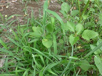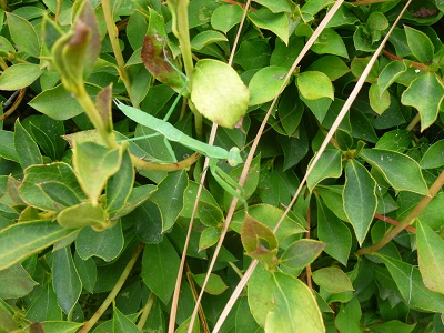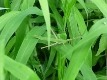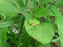 左の写真にはショウリョウバッタが、右の写真にはカエルがかくれていました。
